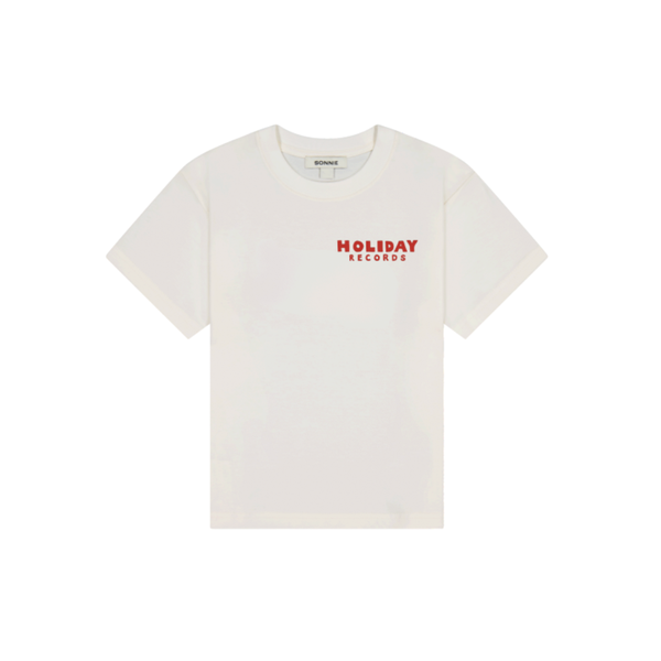 A relaxed short-sleeve t-shirt with 'Holiday Worker' print on back and Holiday Records logo on front chest.